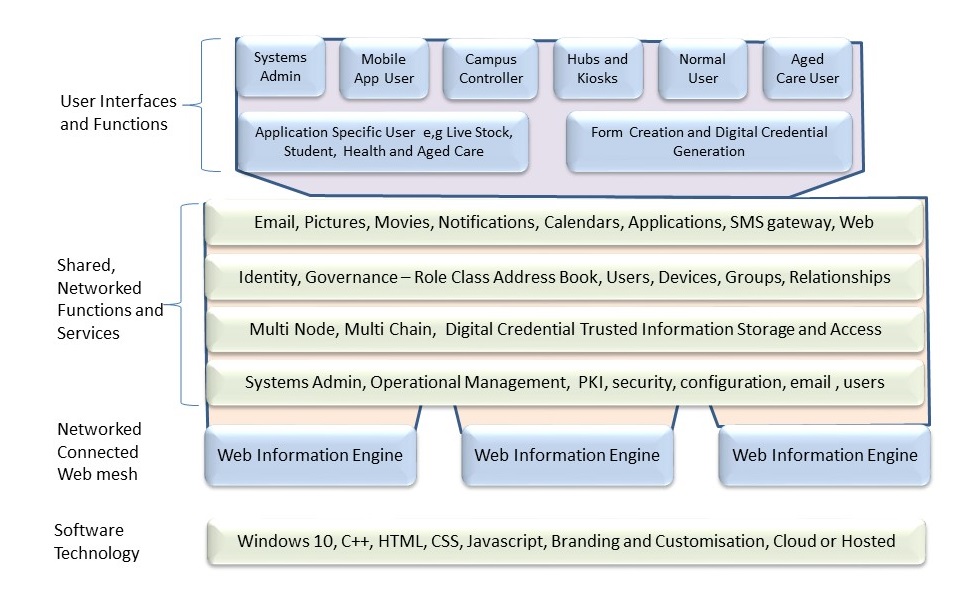 Functions include: identity, user management, content, email, SMS, digital asset multi chains, documents, images, videos, stream cameras, IoT devices, social groups, systems management